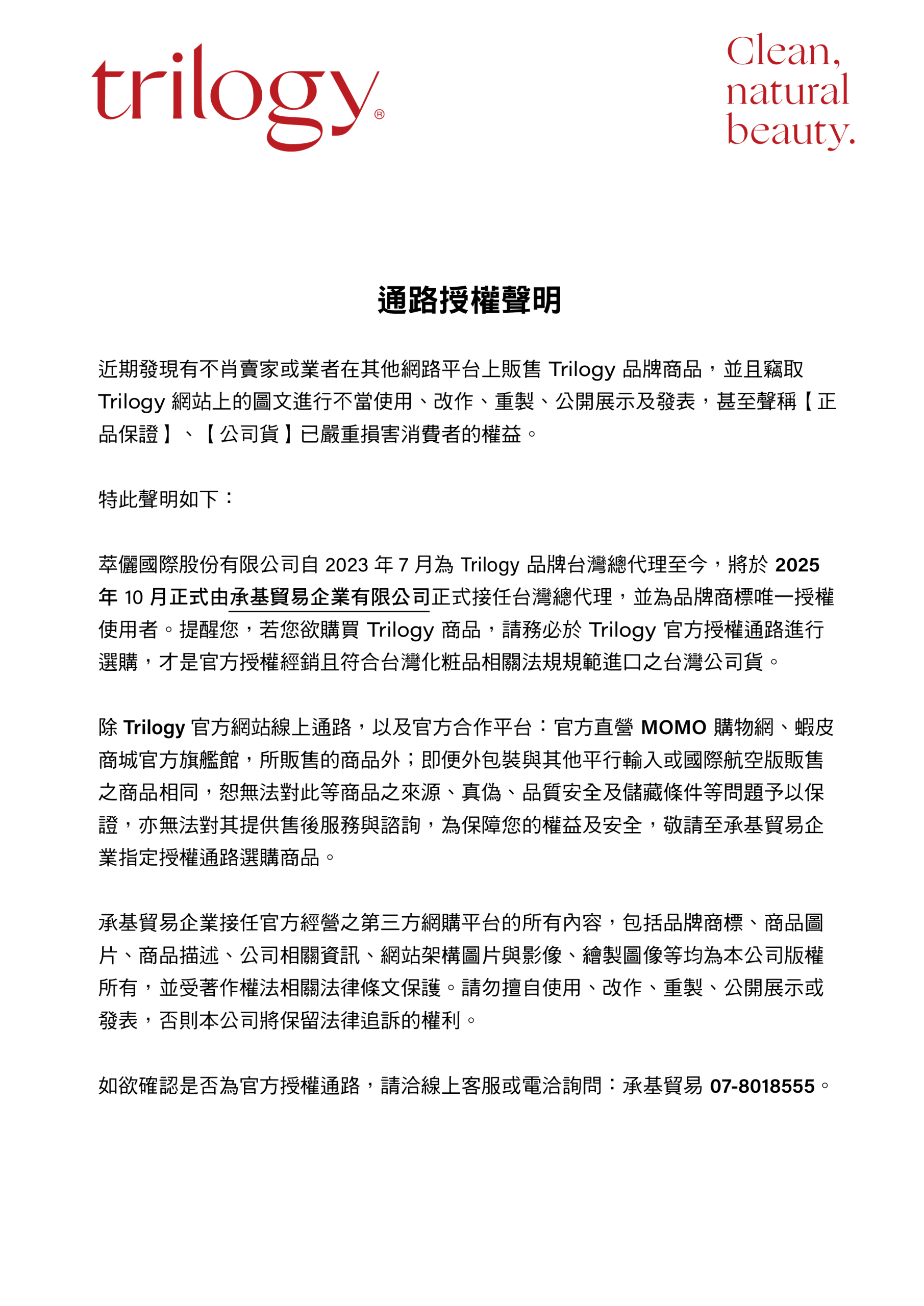 萃儷國際股份有限公司自 2023 年 7 月為 Trilogy 品牌台灣總代理至今,於 2025 年 10 月正式由承基貿易企業有限公司正式接任台灣總代理,並為品牌商標唯一授權使用者。提醒您,若您欲購買 Trilogy 商品,請務必於 Trilogy 官方授權通路進行選購,才是官方授權經銷且符合台灣化粧品相關法規規範進口之台灣公司貨。